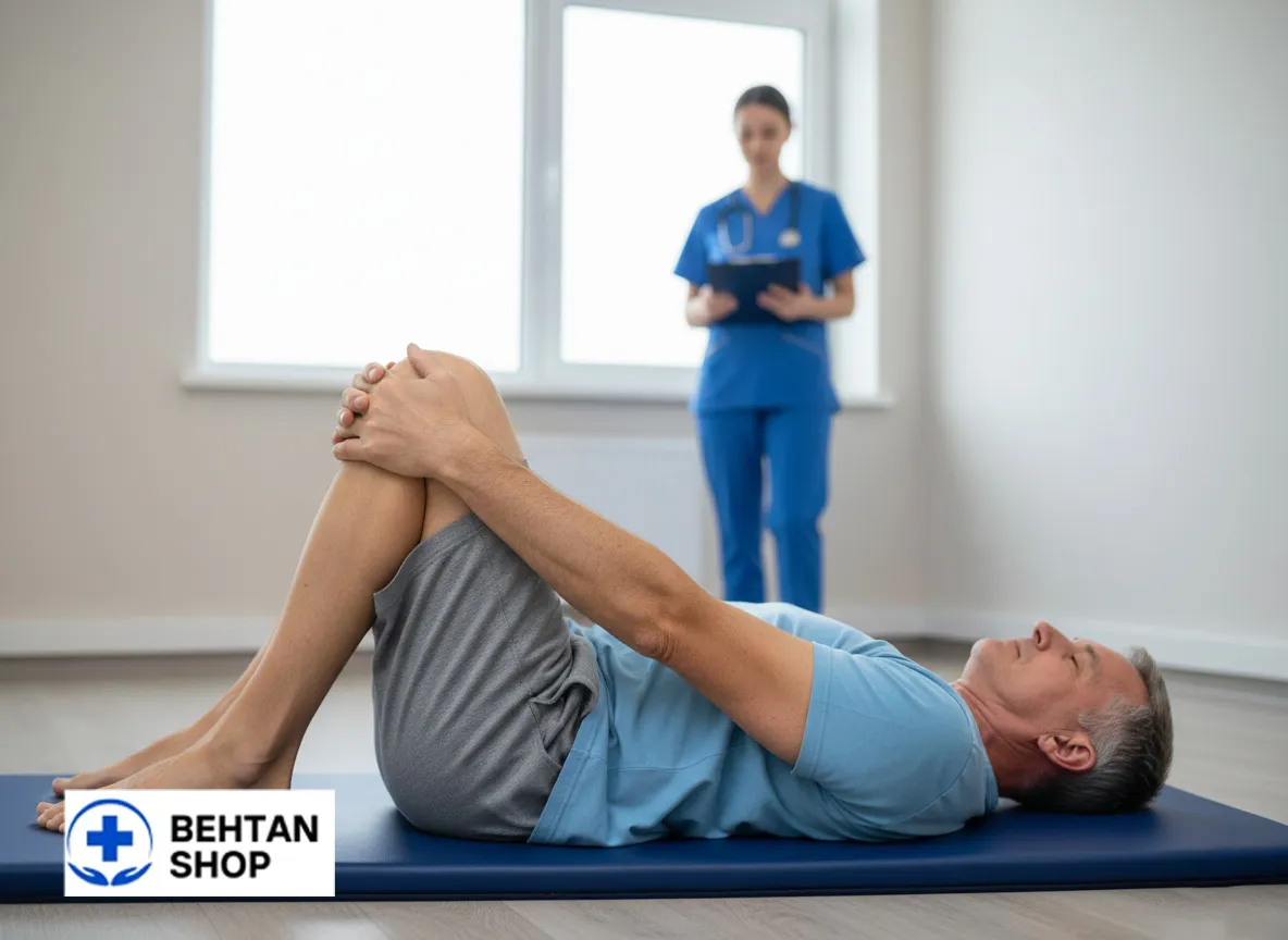 - روش انجام: به پشت دراز بکشید، یک زانو را آرام به سمت سینه بکشید، ۱۵ تا ۲۰ ثانیه نگه دارید. این حرکت را برای پای دیگر نیز تکرار کنید.