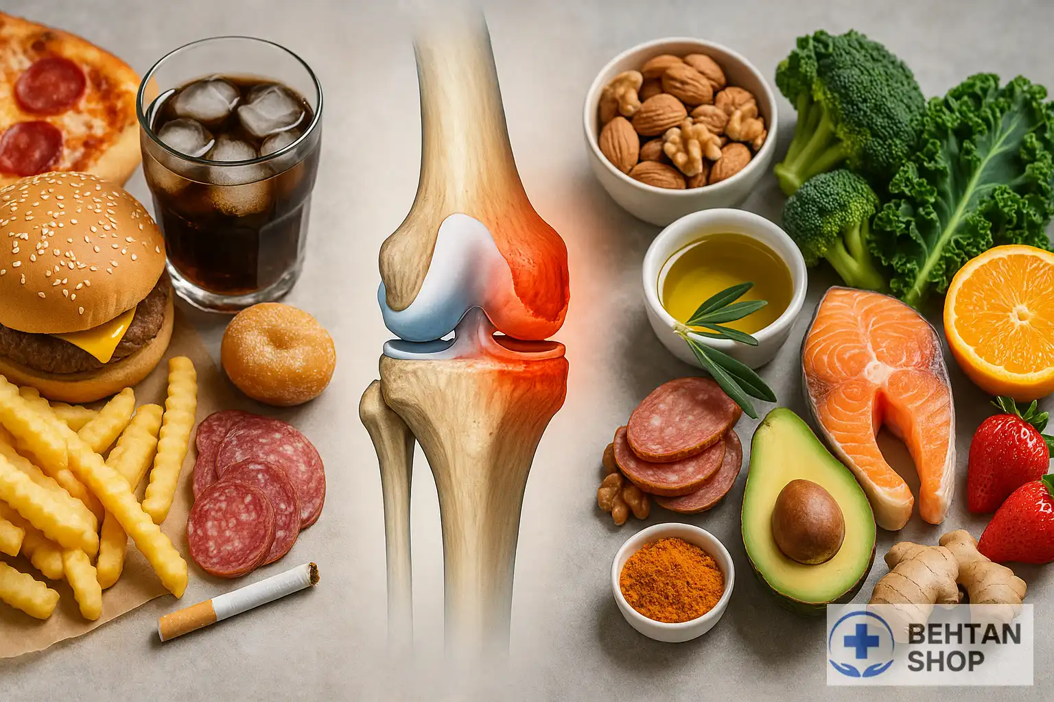 کنترل التهاب: بعضی غذاها التهاب مفصل را کاهش میدهند (مثل ماهیهای چرب و روغن زیتون)، در حالیکه برخی خوراکیها التهاب را بدتر میکنند (مثل غذاهای سرخکرده یا پرقند).
