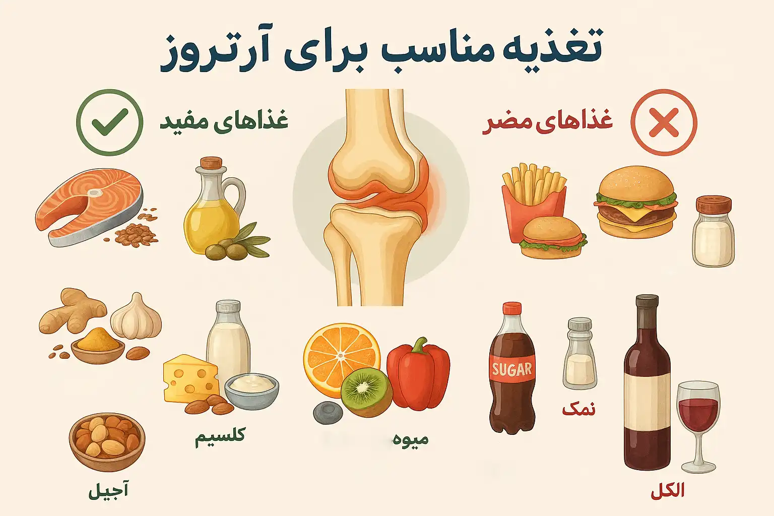 آرتروز یکی از شایعترین بیماریهای مفصلی است که بهویژه در سنین میانسالی و سالمندی بروز پیدا میکند. در این بیماری، غضروف مفصل که مثل بالشتک نرم بین استخوانها عمل میکند بهتدریج دچار تخریب میشود. نتیجهی این فرایند چیزی جز درد، التهاب، خشکی و محدودیت حرکتی نیست. بسیاری از بیماران با این سؤال مهم روبهرو میشوند: «چه غذایی بخوریم تا آرتروزمان بهتر شود یا دستکم درد و پیشرفت آن کمتر شود؟»