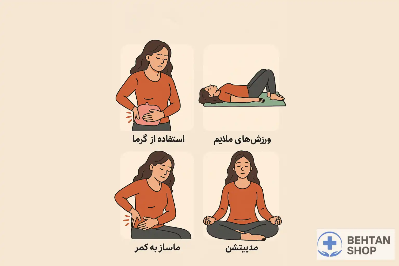 کمر درد پریودی همیشه نیاز به دارو یا درمان پزشکی ندارد. در بسیاری از موارد میتوان با روشهای ساده خانگی شدت درد را کم کرد و کیفیت زندگی را در این روزها بالا برد. این روشها به سه دسته تقسیم میشوند: